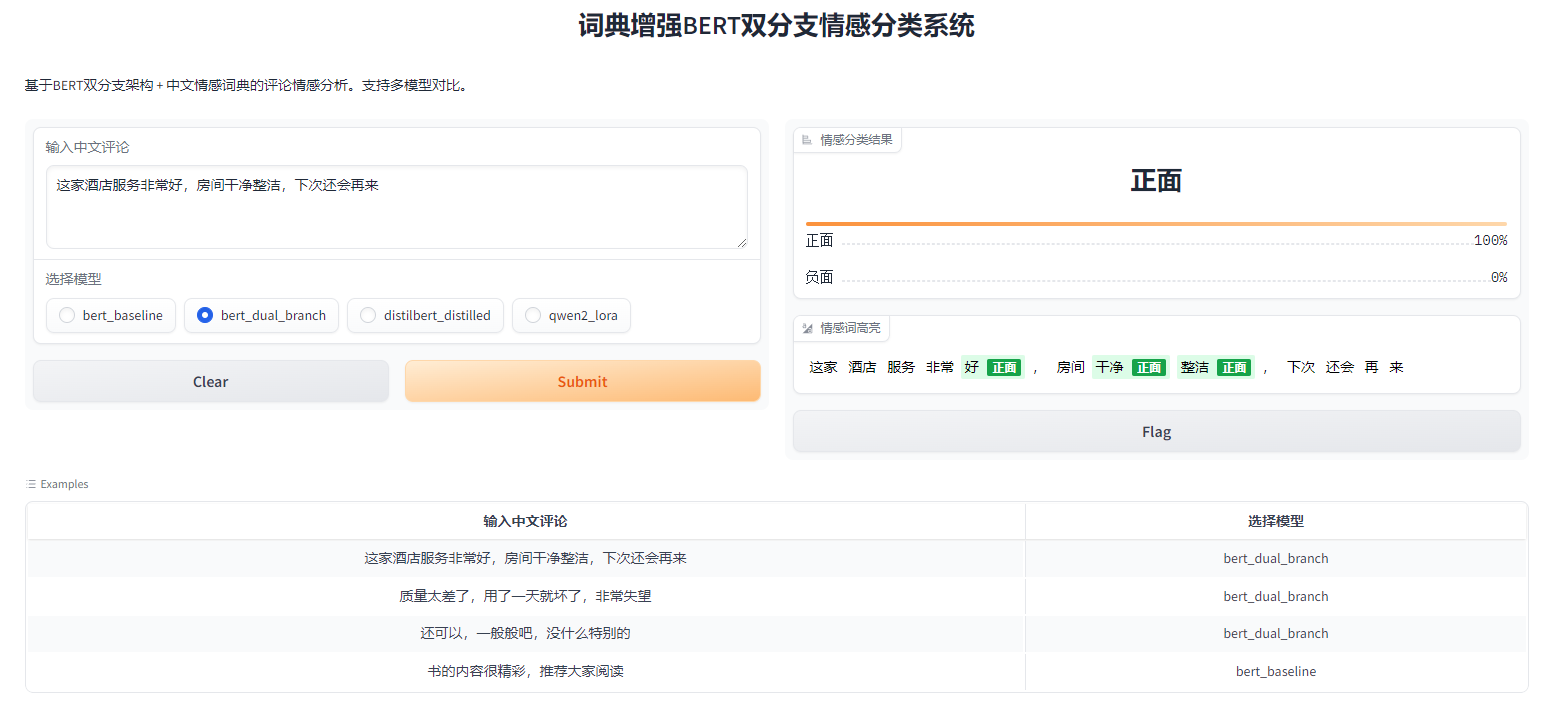 基于 ChnSentiCorp 中文情感数据集(12,000 条),完成词典增强 BERT 双分支建模、DistilBERT 蒸馏与 INT8 量化,并新增 Qwen2-1.5B 的 LoRA/QLoRA 微调链路;其中双分支方案通过对每个 token 做情感打分与监督,显式增强模型对局部情绪线索的识别能力。
